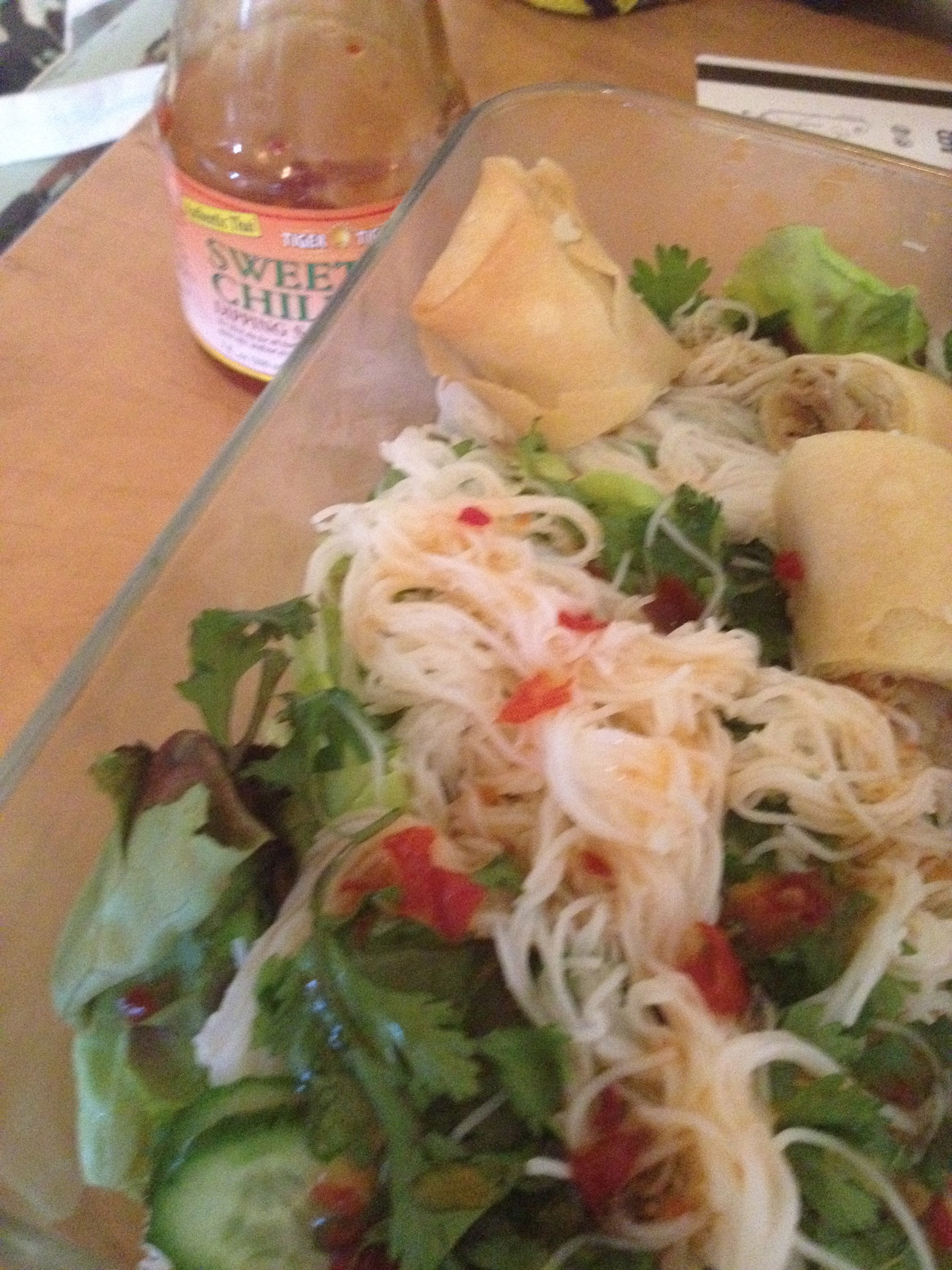 Place the lettuce at the bottom of a large bowl. Then the cucumbers. Dress with 1/2 the remaining dressing. Once the noodles are no longer warm, put those on top of the salad.
