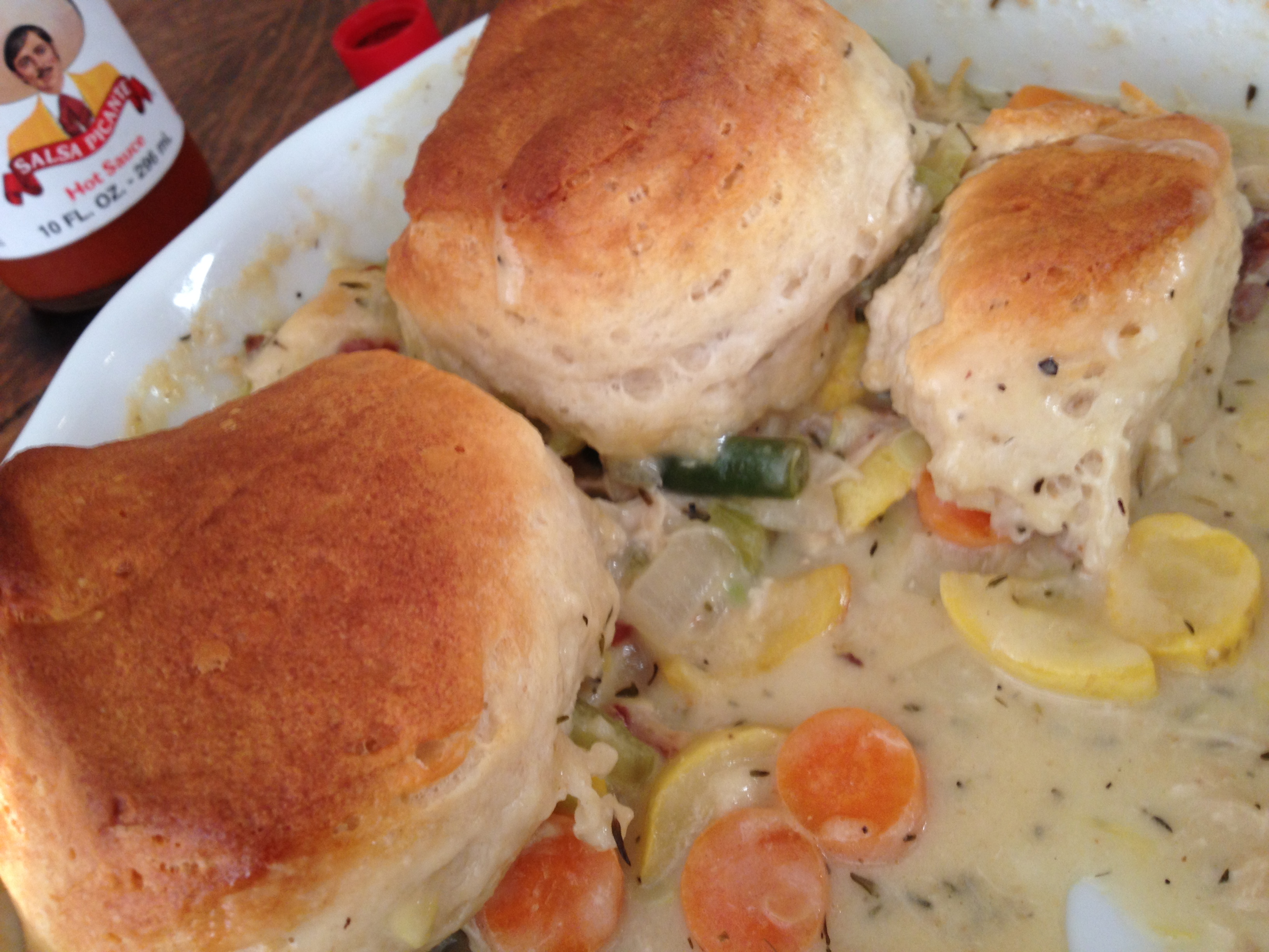 Pot pies now mean something different to me. They are refuge for leftovers. The other night we had roast chicken and saute yellow squash and green beans. We had leftover bacon from breakfast and I had some premade biscuits in the fridge as well. So, the next night when I was looking for something to cook, a family pot pie seemed to be the quickest and most comforting option – sans TV and TV trays unfortunately.
