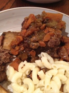 Get out your dutch oven and heat up a bit of olive oil over medium-high heat. Salt and pepper your short ribs and sear them in the pot. Remove. Reduce the heat and add in the onions, carrots, celery, garlic and thyme. Cook slowly until fragrant. Add in the mustard and stir it up until fragrant again. Then add in the beer and broth. Bring to a boil. Take off the heat, add the short ribs with the meat side down. Cover and pop in the oven for about 3 1/2 hours or until the meat melts at the sight of a fork.