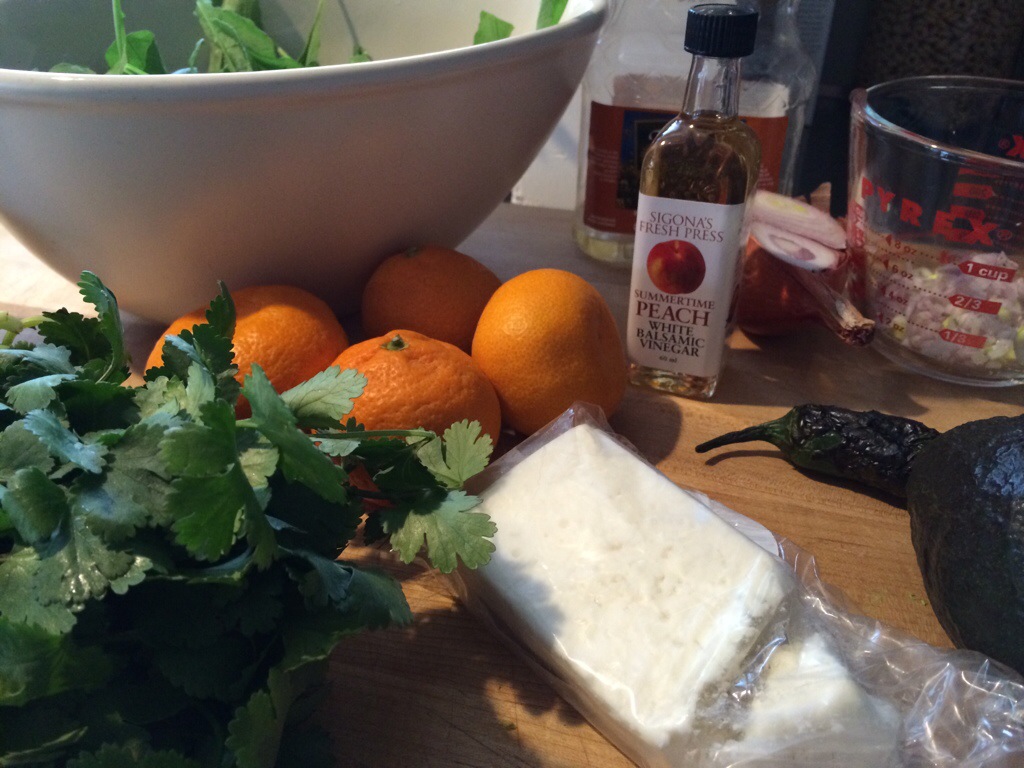 The roasted jalapeño in the dressing is the key to the warmth. But the richness of the avocado, the refreshing jolts from the mandarins/tangerines and the feistiness of the arugula all add to the excitement of this salad’s hugs.