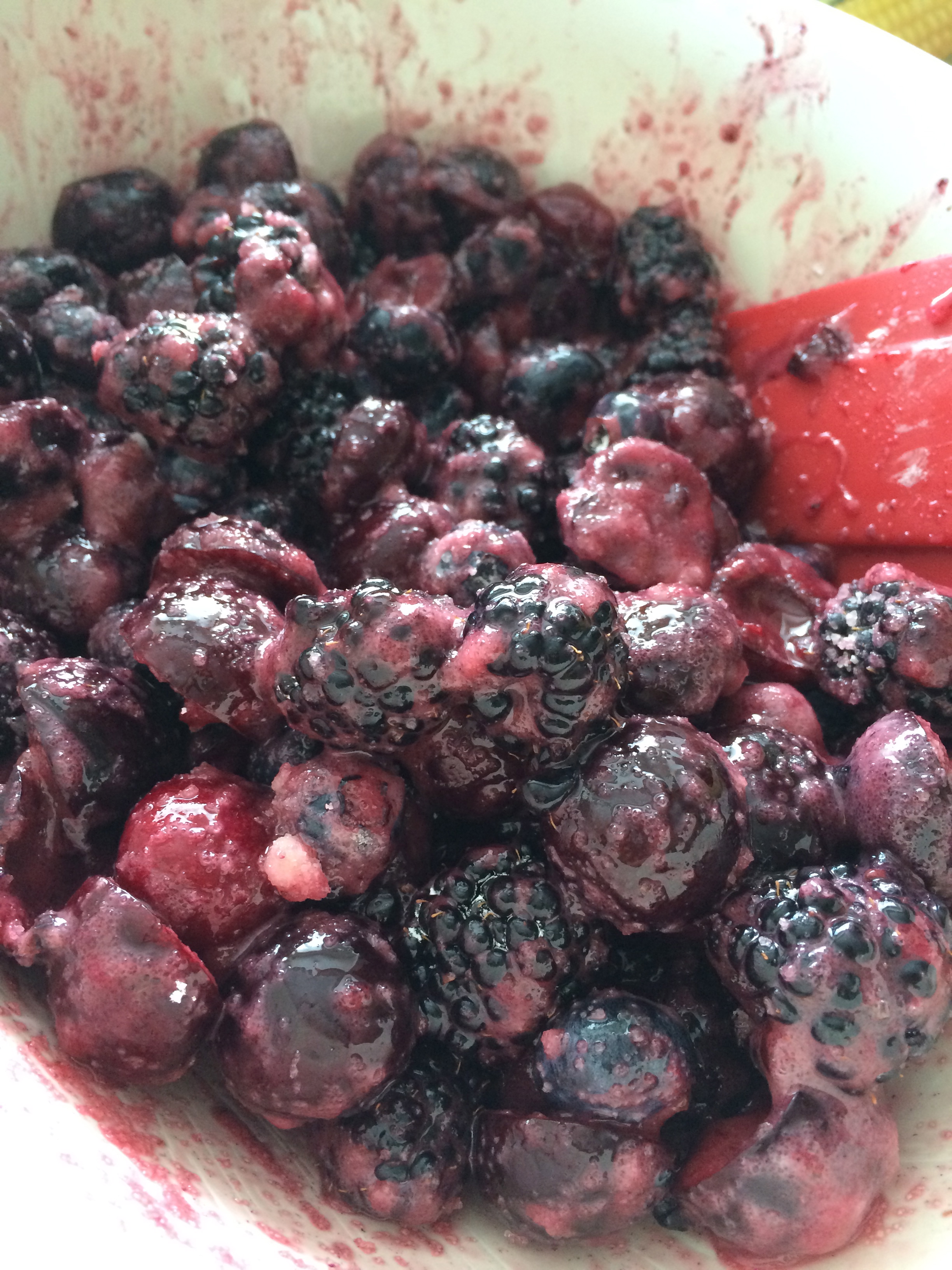 - 2 1/4 pounds fresh cherries (pitted), blueberries and blackberries (I used a pint of blueberries and a pint of blackberries and 1 1/2 pound of cherries)