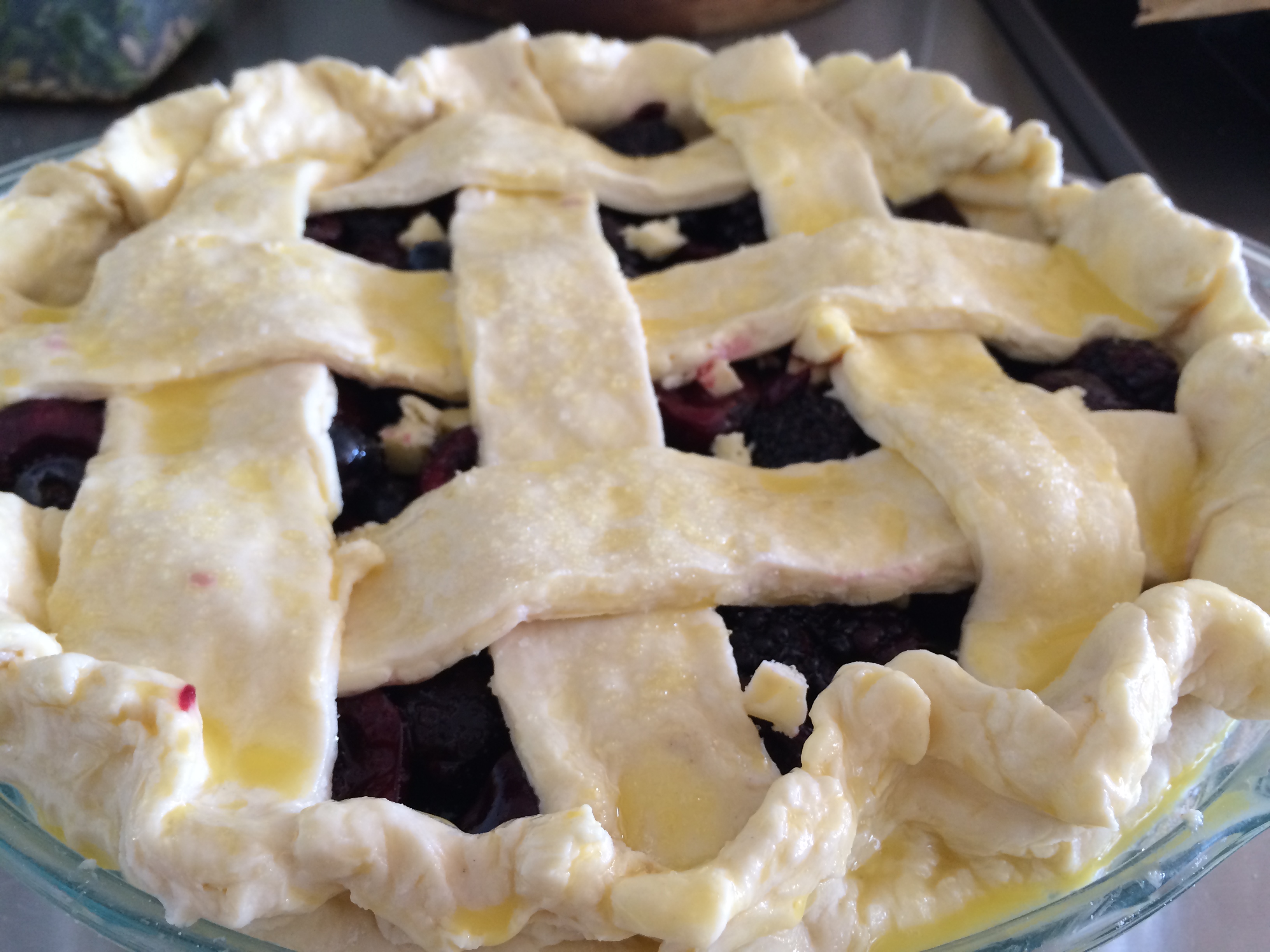 Assemble the pie: Pour the cherries and berries into your pie shell. Sprinkle the butter pieces across the filling. Lay three of your top dough strips vertically and evenly spaced across the top of your filling. Then weave in the remaining three pieces horizontally. Pinch the top strips into the bottom crust and crimp decoratively. Brush the top of the dough with your egg wash. Sprinkle with sugar.