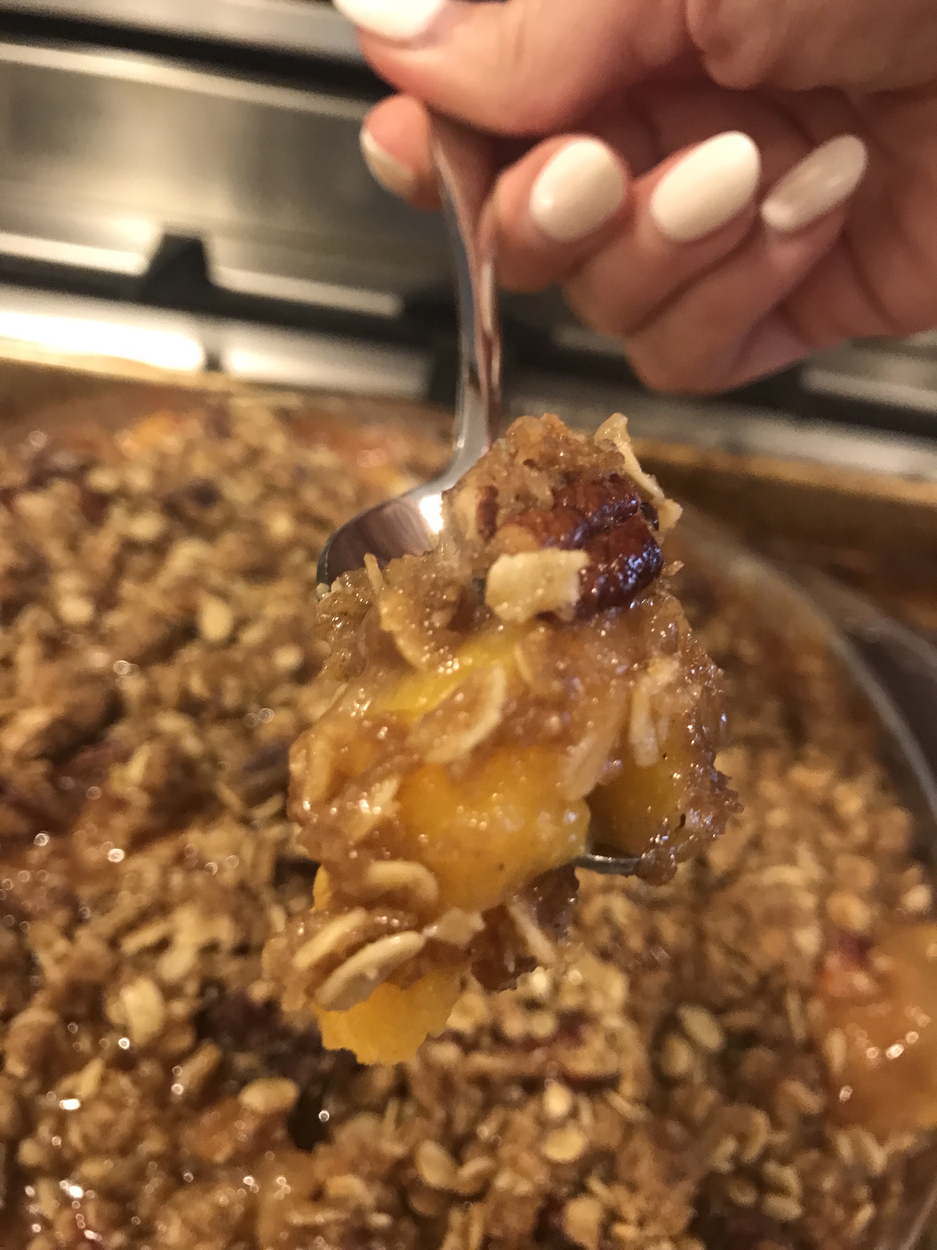I’ve made tons of crisps over the years. I’ve done all the berry combinations and have always loved how easy they are to throw together. Then, I had this one. You guys, it is mind blowing good. The peaches with the pecans, not to mention the stick of butter. It is perfectly crispy with warm oooey peaches. You should make this today.