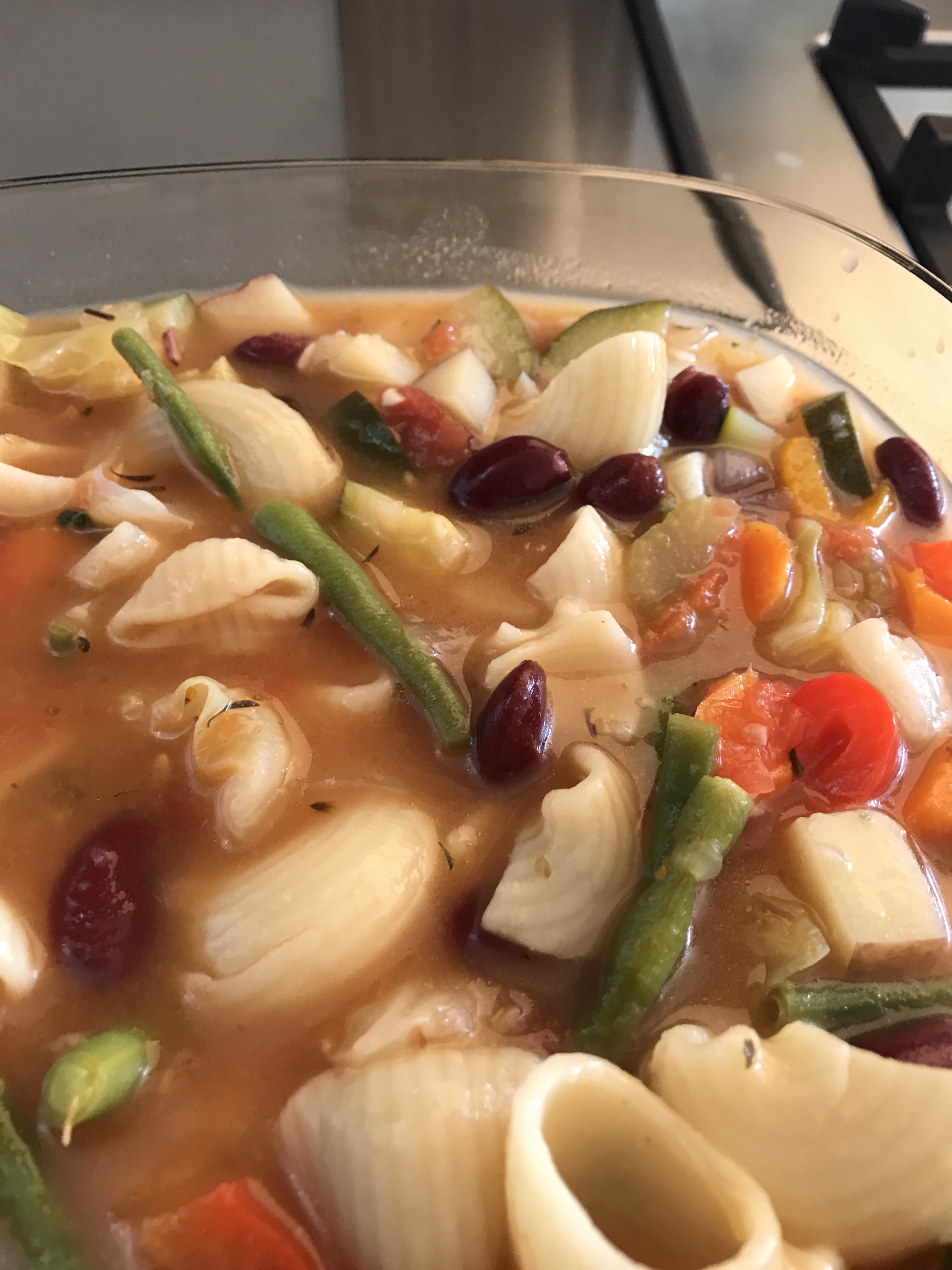 In a large stock pot, heat olive oil on medium heat. Add onions, garlic, celery, carrots, and potatoes and about 2 tsp salt. Cook for 5 mins. Add thyme, oregano, zucchini, bell peppers, pasta, 4 cups of stock and tomatoes. Cook for 10 mins. Add green beans, cabbage and kidney beans. Cook until pasta and potatoes are tender. Add stock if needed and salt to taste. Once cooked, add fresh basil and top with Parmesan.