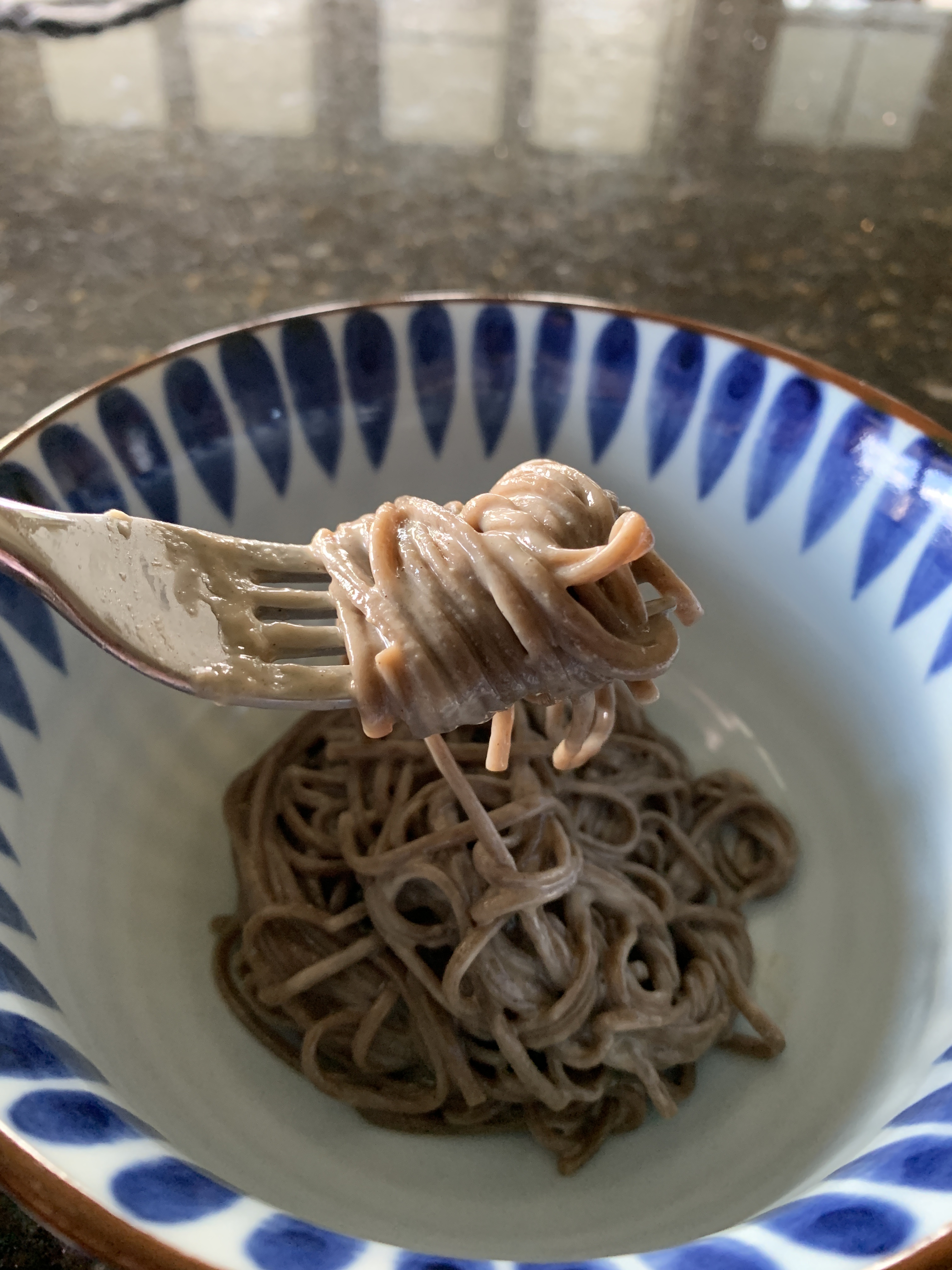 Cook noodles for 5-6 mins. Drain. Add braggs and cashew butter and water. Mix and eat.