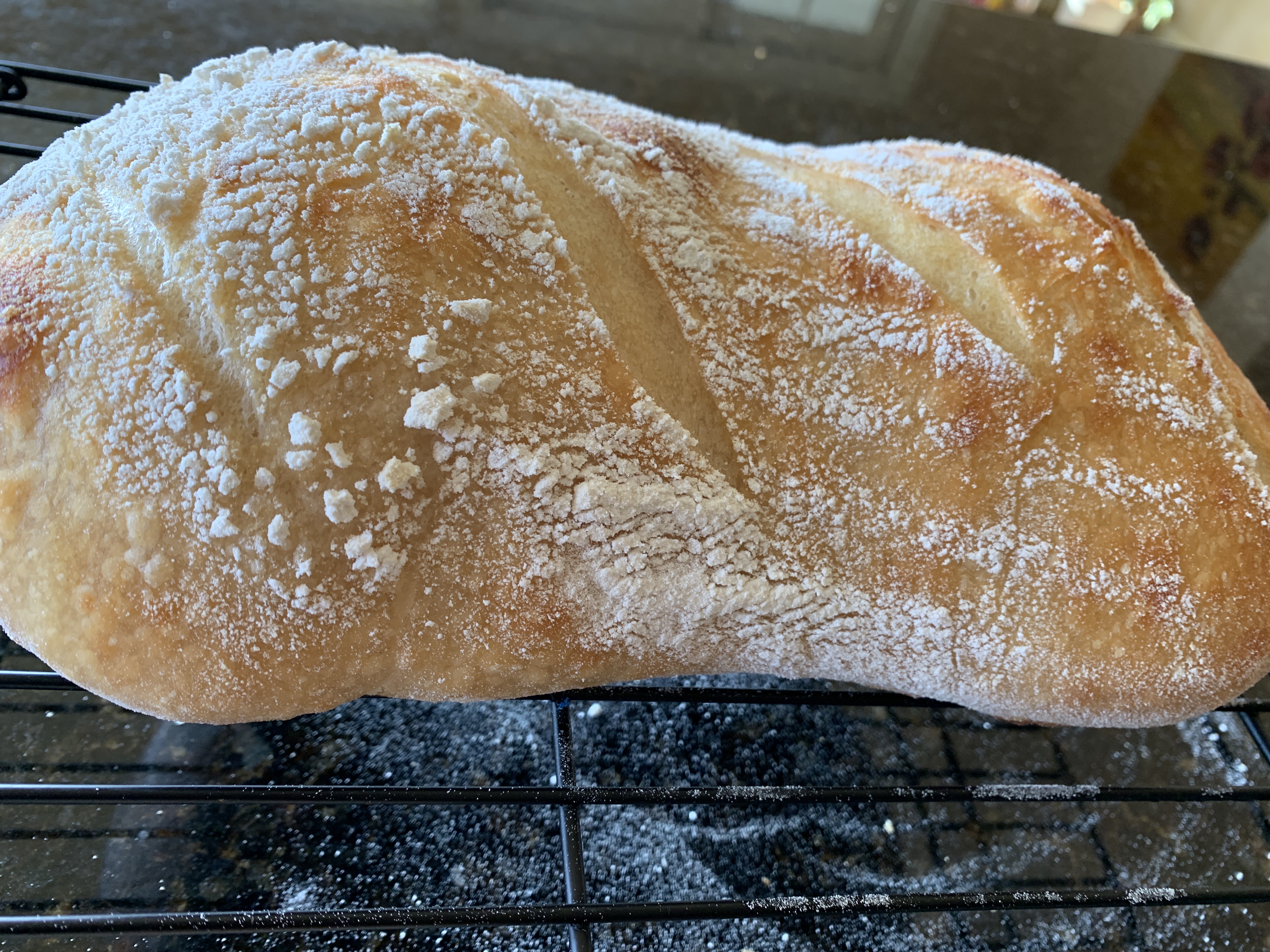 Transfer bread to a wire rack to cook for at least 15 mins before slicing. The bottom of the loaf should sound hollow when tapped. Increase oven temp to 500 degrees, clean out the pot and repeat the process with the second loaf.