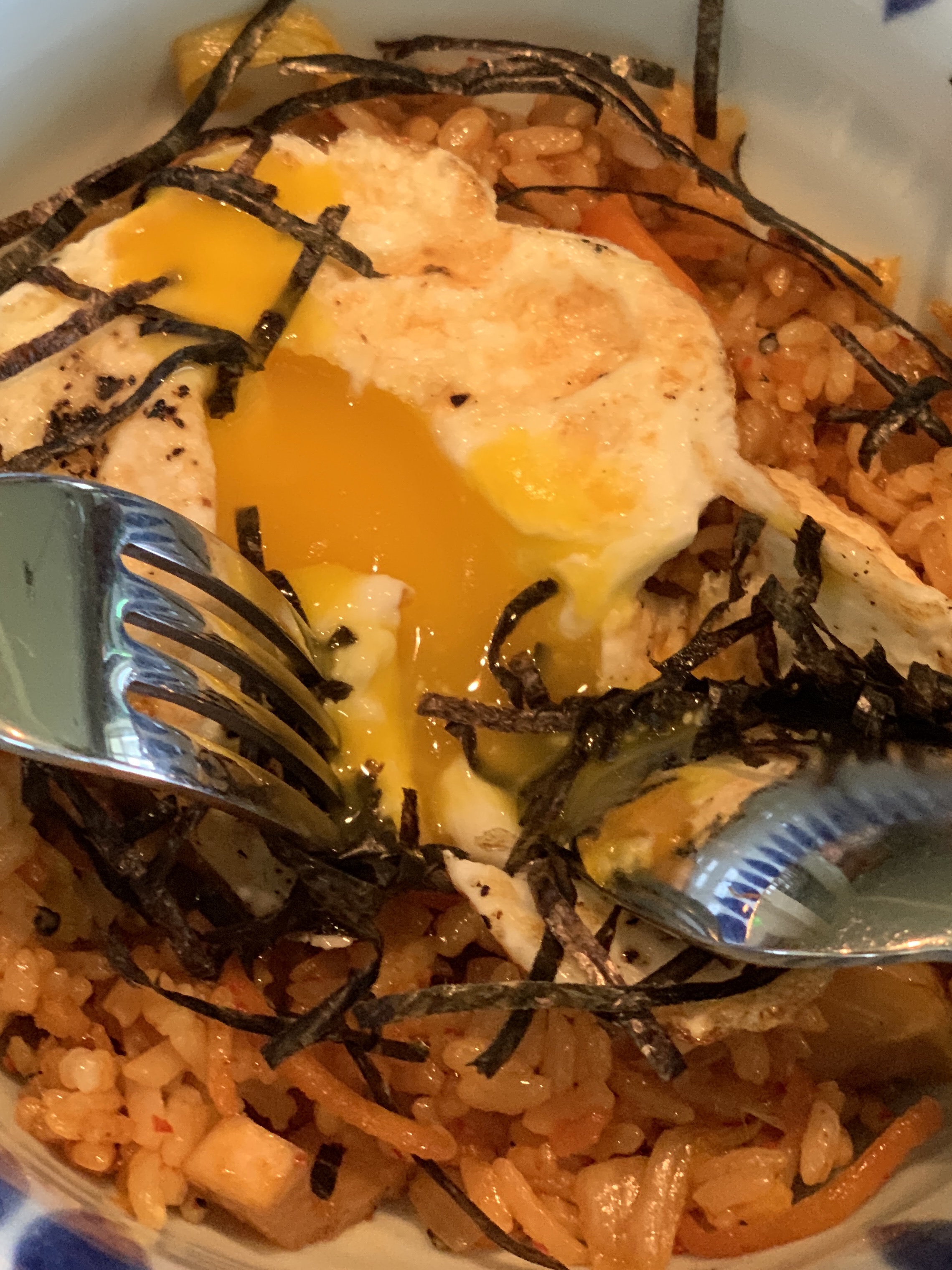 Remember those miso turnips that I made the other day? Leftovers found their way into this kimchi fried rice and it was perfect. Also, if you’ve got a pork chop or steak or chicken, grill it right quick and add that on the plate too. This can be a main meal or just a side to your protein. It’s tangy and spicy and the perfect amount of probiotics. I ate mine with a fried egg on top because – chickens in my backyard are laying, laying, laying.