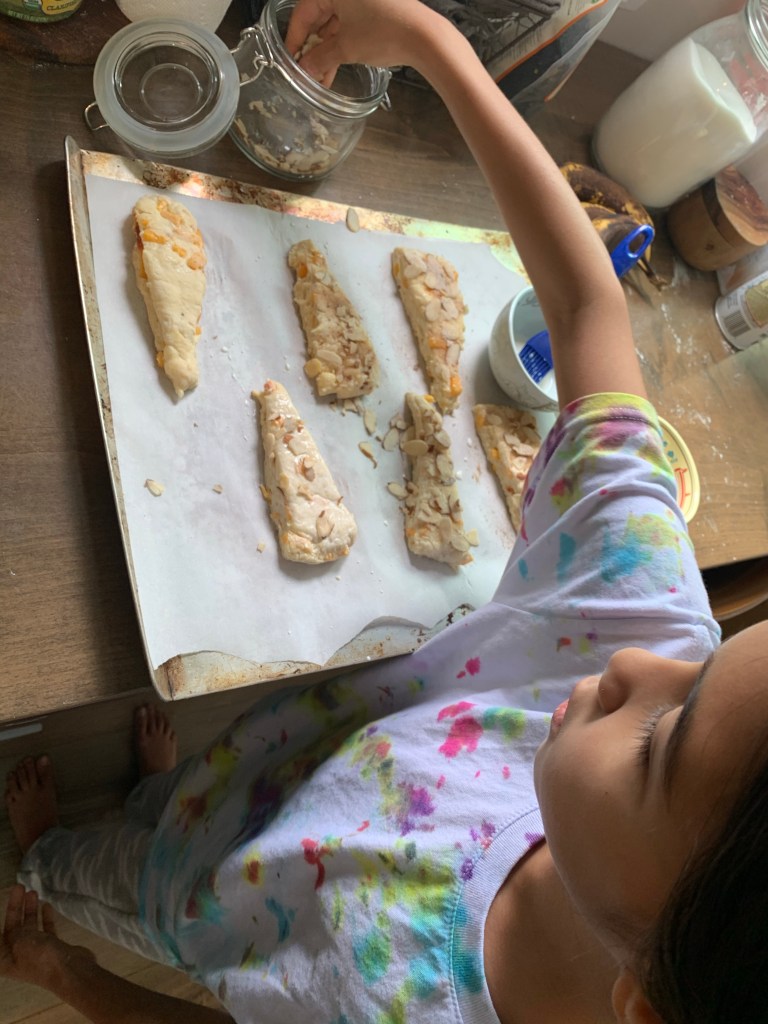 For the ones you’re baking now, If you’re using soft fresh fruit, you can stuff the scones. To do this, simply cut off the top and reassemble the bottom shape, place thinly sliced fruit on top of the bottom. Reassemble the top and smoosh it on top of the fruit. You can skip this step. Brush with half and half. Add shaved nuts (I used almonds) if you’re using. Sprinkle with cinnamon sugar.