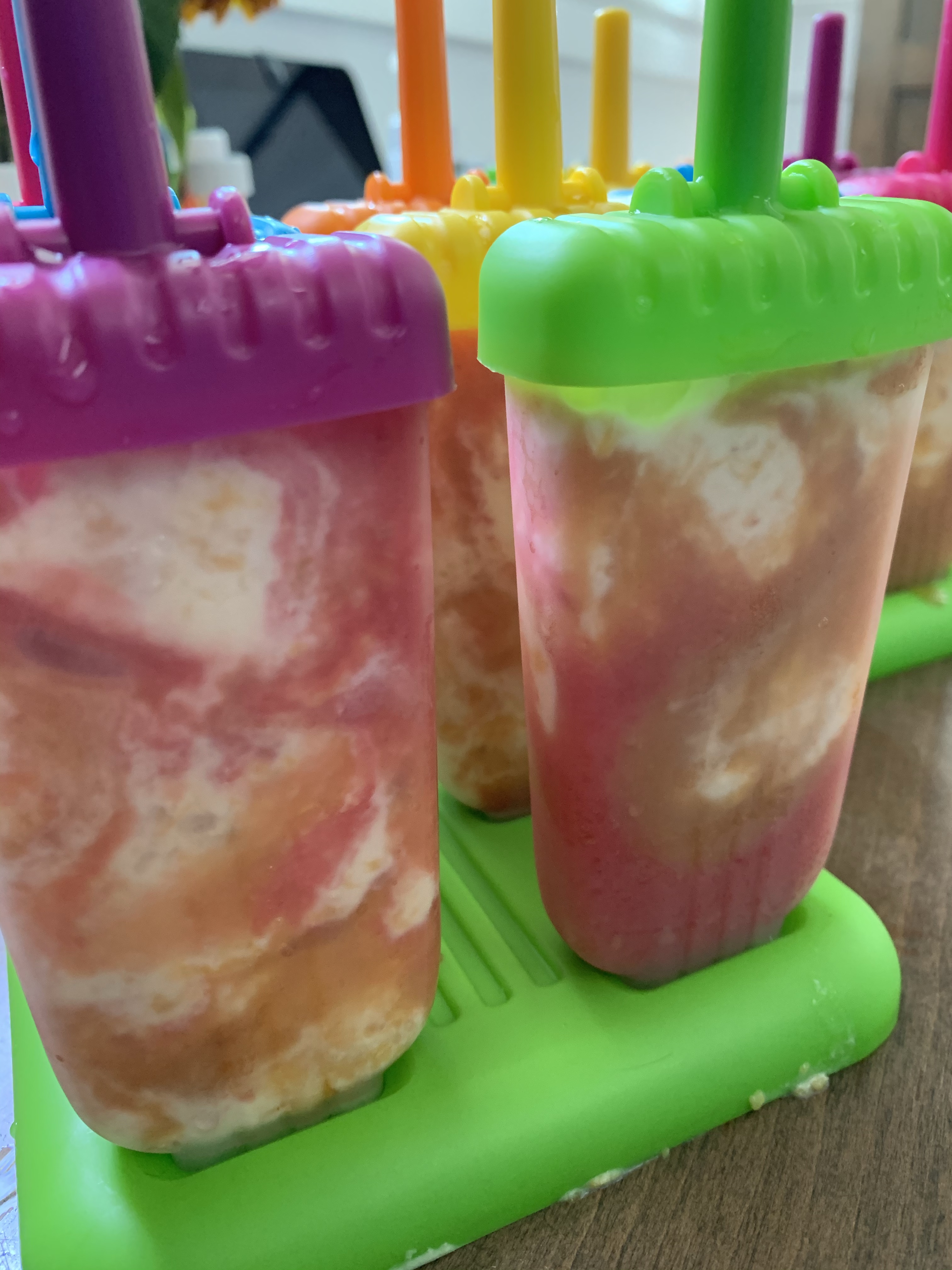Now assemble the popsicles by adding a little bit of raspberry puree, a little of the peach purée and then add the ice cream. Freeze overnight and then enjoy!