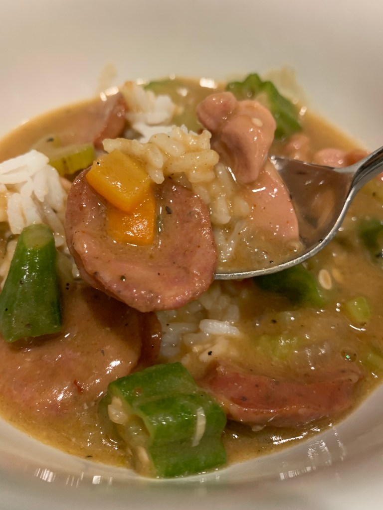 We had the best time at Disneyland. Now that I’m home, I’m missing the food so bad. We were lucky enough to get reservations at The Blue Bayou one day and enjoyed the gumbo and 2 glasses of Pinot Noir. So, why not try to recreate it – missing the boats rolling by.